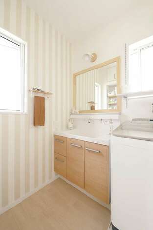 ストライプの壁紙と 造作した大きな木製枠の鏡がおしゃれな洗面脱衣室 イエタテ